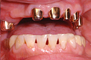 1.術前 全ての前歯と左の奥歯に連結」した固定式のブリッジが入っていて、右側は金属の入れ歯が入っています。外観からは金属と歯の境目から虫歯になっていることが分かりますが、全部連結してあるのでブリッジはびくとも動きません。 |